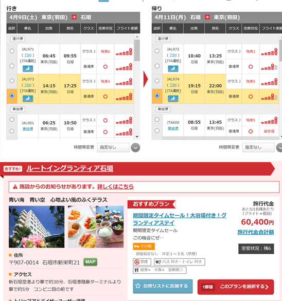 2022年3月15日にJALホームページにて、往路2022年4月9日㈯、復路2022年4月11日㈪のフライトを検索しました。