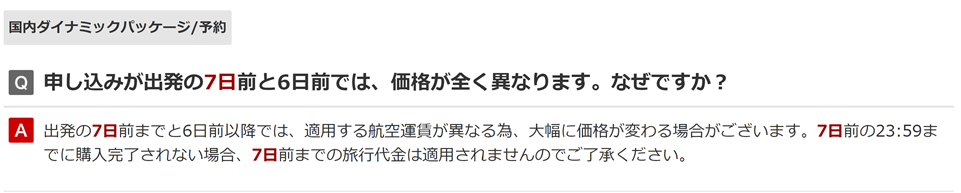 なお、DP周遊プランは確かに出発1か月以内の直前期でもお得なことは確かですが、出発6日前以降は料金がガラッと変わってきます。