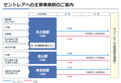 セントレアから名古屋方面へは名鉄空港線で簡単にアクセス可能。