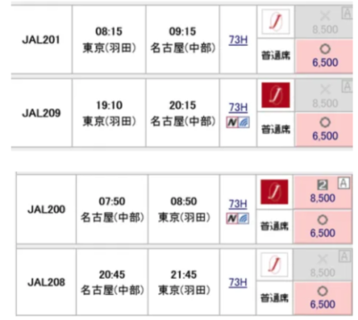 | 1 | JAL201 | 羽田[08:15]→中部[09:15] | ウルトラ先得 | 6500 |
