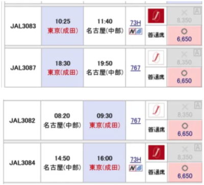 | 3 | JAL3087 | 成田[18:30]→中部[19:50] | ウルトラ先得 | 6500 |
