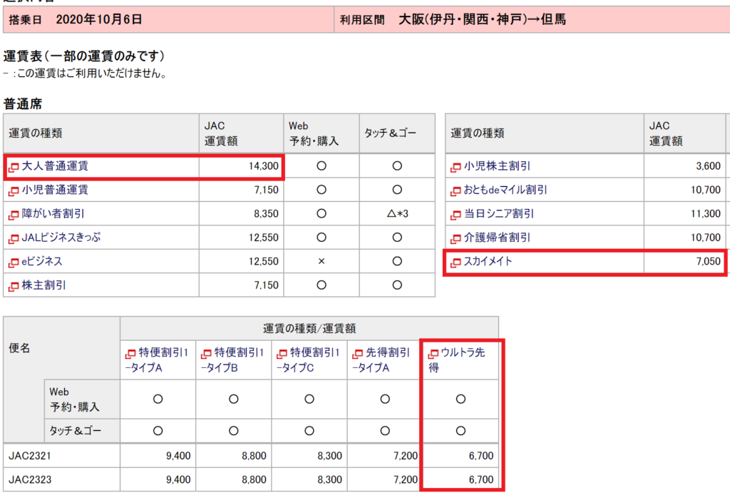 実際に、2020年下半期(オフピーク期)普通運賃とスカイメイトを比較すると、