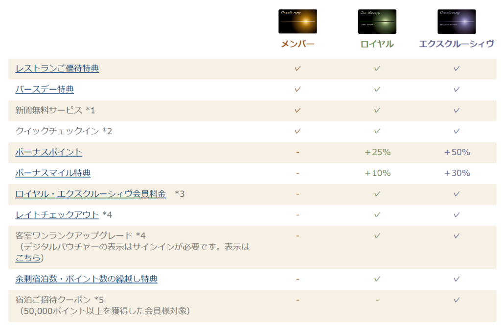 - 客室ワンランクアップグレード(ロイヤルは5回まで、エクスクルーシィブは制限なし)