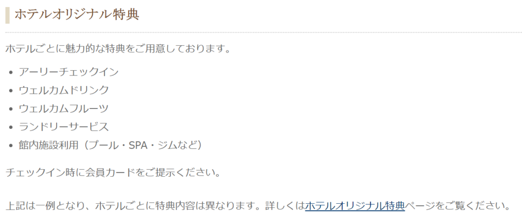 こちらは各ホテルにより特典内容が異なり、主な特典としては次のようにまとめられています。
