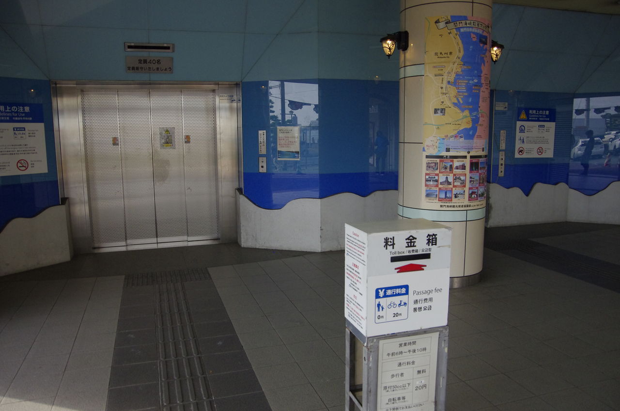 関門トンネル人道は自動車専用トンネルの真下にあり、そこまではエレベータで移動することになります。