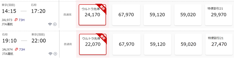 この日の場合、往路は24,170円、復路は22,070円となりました。