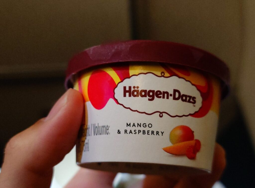また一部の路線のみかもしれませんが、キャセイでもハーゲンダッツが提供されることがあります!次の画像は仁川✈香港便。マンゴー&ラズベリー味。珍しいですね