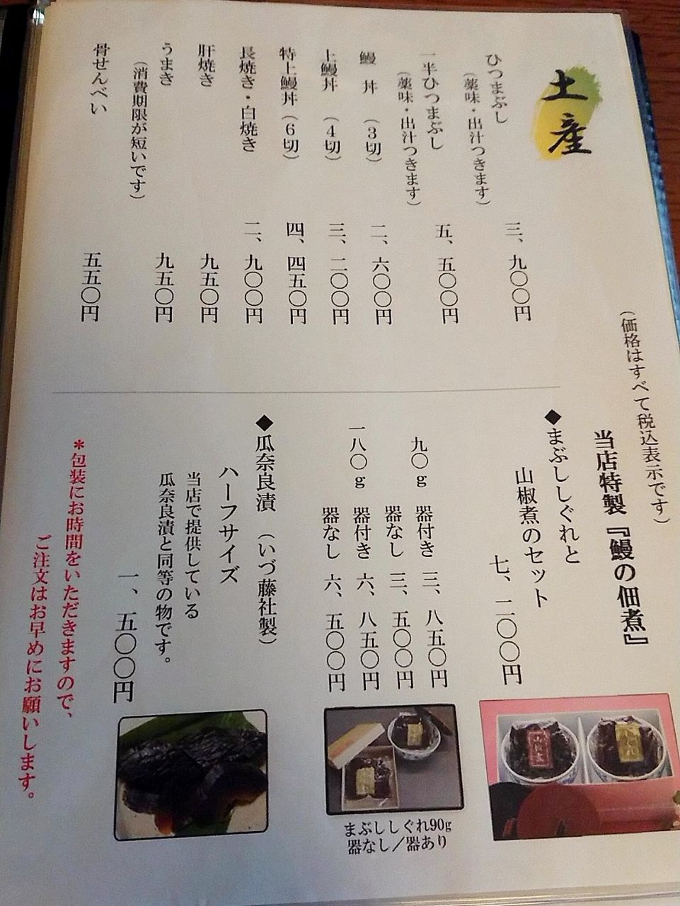 店内メニュー同様に、ひつまぶしや鰻丼、長焼き、うまきなど様々なメニューが持ち帰りできます。