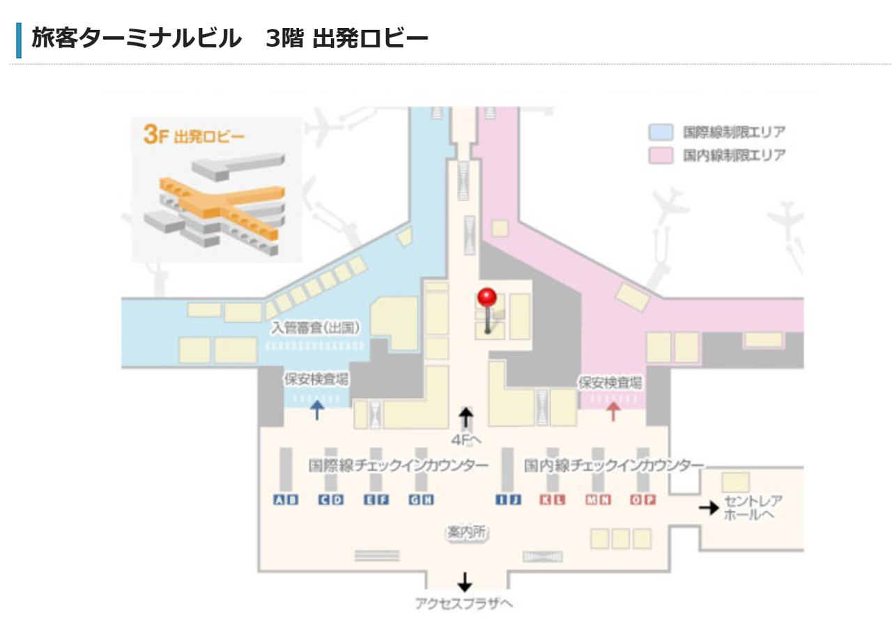 場所は国内線・国際線両方の保安検査場から近く、歩いて2,3分程度でとても便利。