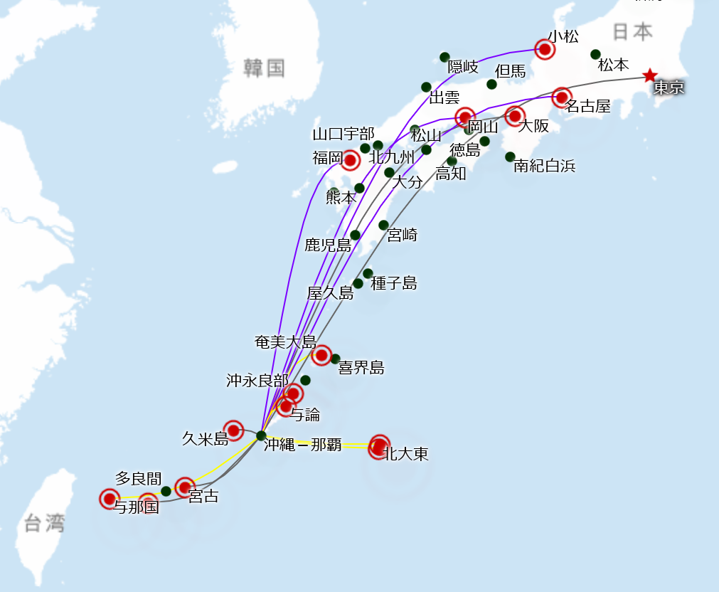 他にも料金は別として、小松や岡山など一見意外とも思える空港とも路線で結ばれているところが面白いです。