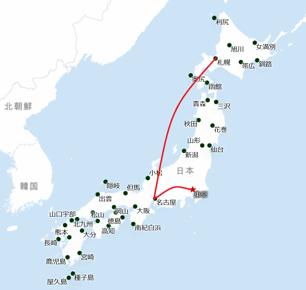 マップからも分かる通り、東京から一度反対側の名古屋に寄り道した後、北海道に向かうという何とも変なルートとなります。