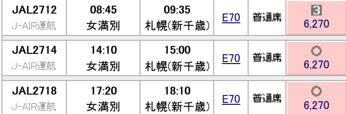 新千歳-女満別線は1日3往復運航されており、いずれの便も6,270円となっています。